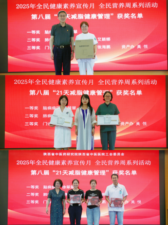 陕西省中医医院党委副书记、纪委书记、工会主席刘小宾在活动颁奖仪式上指出,此次减脂管理活动是医院落实“健康中国”战略的具体实践,中医食疗与现代健康管理技术结合,既发挥中医药特色优势,也为职工搭建科学体重管理平台。希望通过21天标准化干预,帮助大家建立“吃动平衡”健康习惯,让医务人员以更充沛体魄服务患者,同时将健康管理理念辐射社会,实现“全民营养、全民健康” 宗旨。
